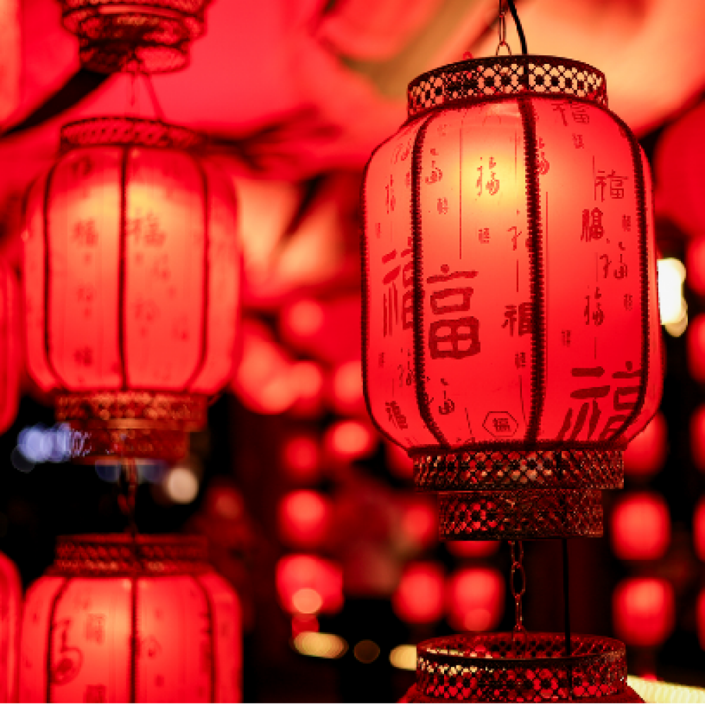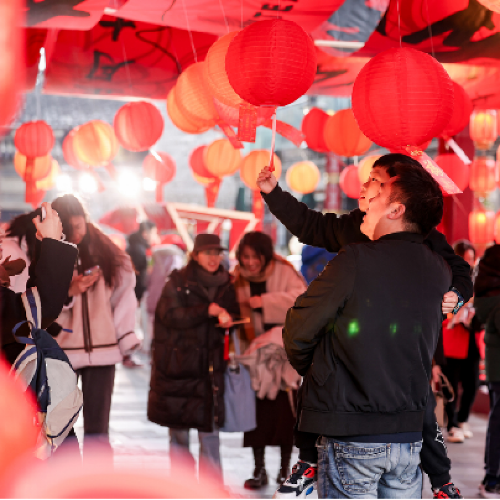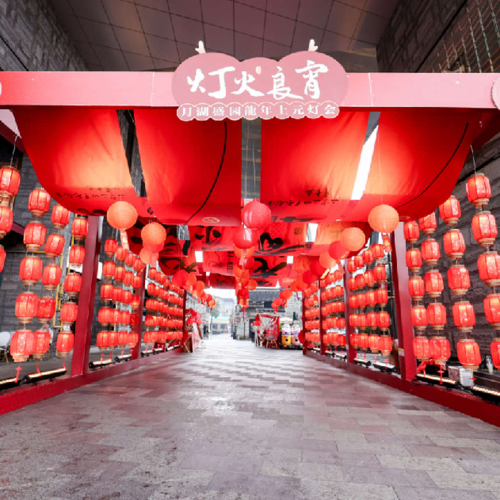 在園區(qū)主入口的大型燈籠走廊,近300盞燈籠,加上書法吊幔,給每一位走進園區(qū)的顧客濃郁的節(jié)日氛圍感。