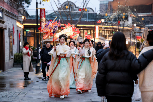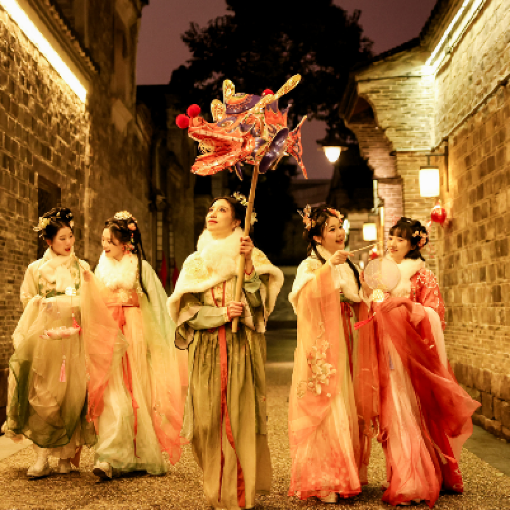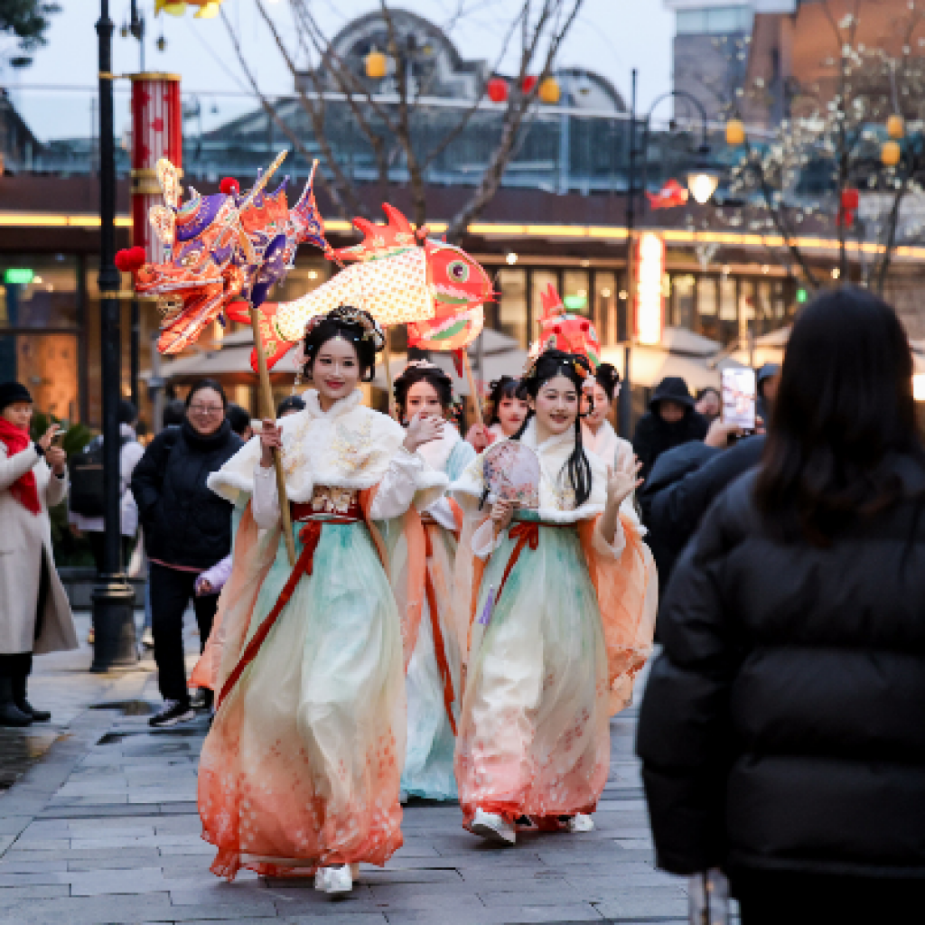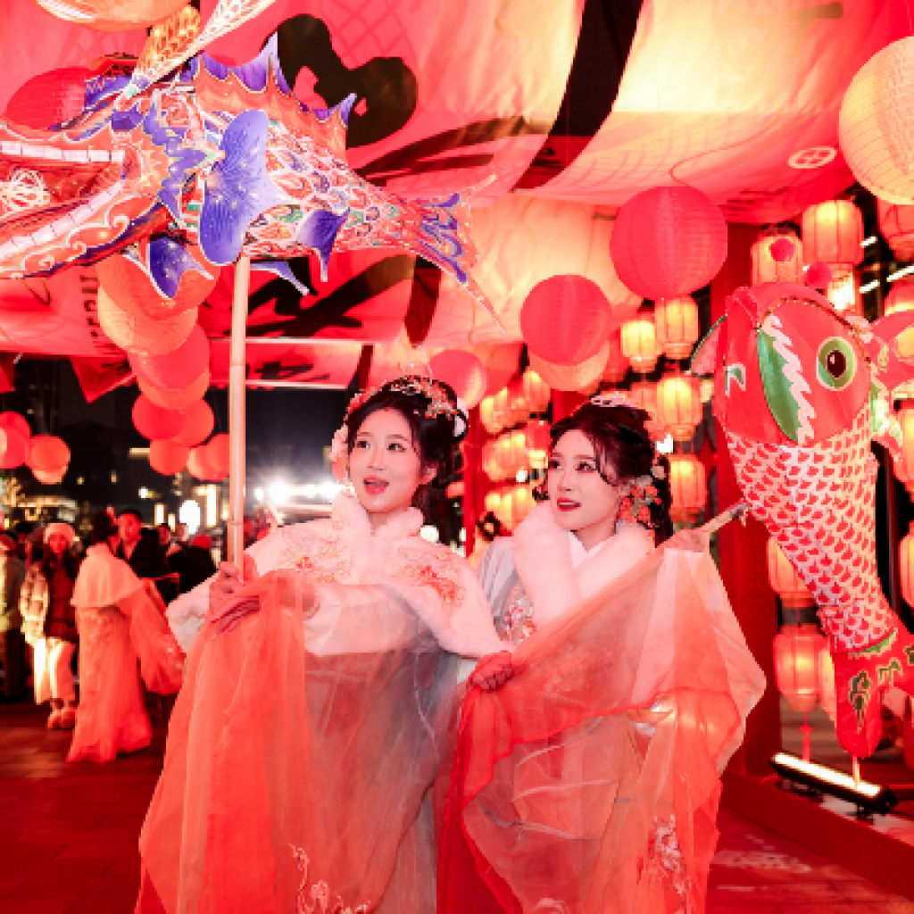 精致的魚龍燈古風巡游出現(xiàn)在主街和小巷,與顧客互動、翩翩起舞;